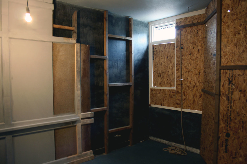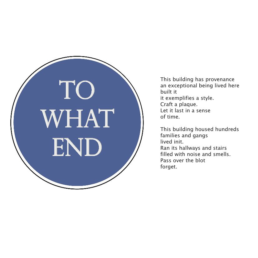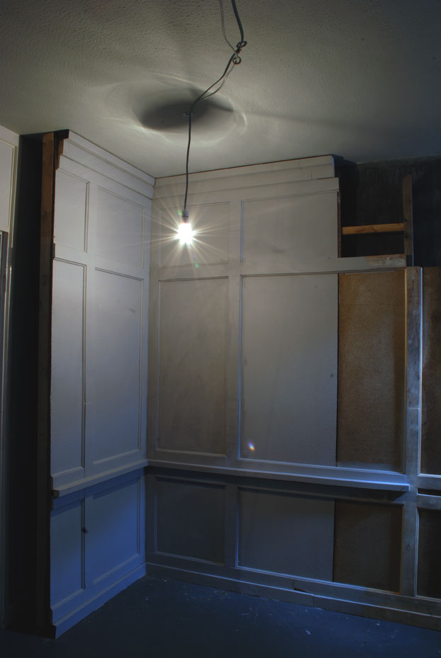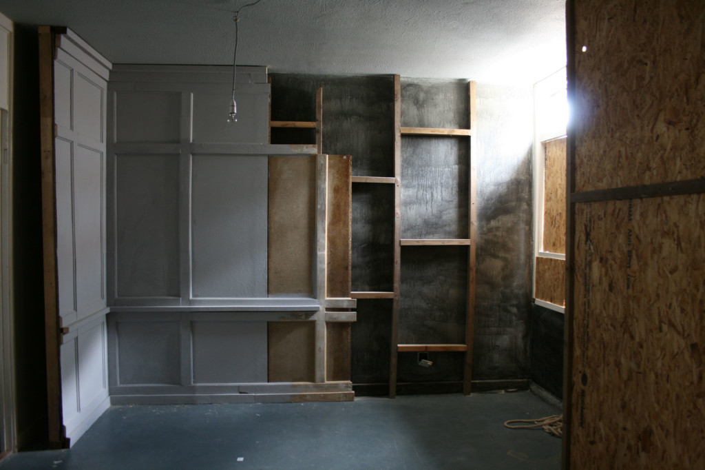 Shift Gallery was set within a council estate in Mile End, utilising a Bows Art live/work unit. This was the last exhibition to be held in the gallery; the building was demolished with the installation still intact. The building was predominantly social housing, but was to give way to ‘luxury’ apartments. TO WHAT END questioned the hierarchy of spaces. The interior referenced the boarded-up language of the estate, set in opposition to added wooden panelling referencing an interior that would more likely be preserved in historically listed interiors.